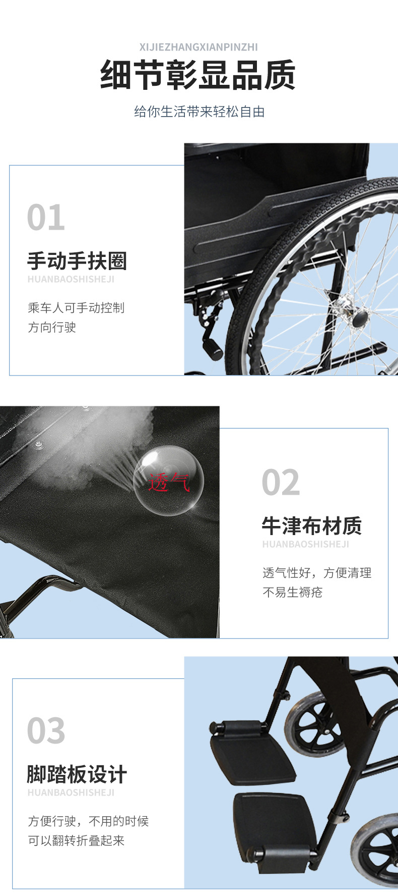 2、小車(chē)輪直徑有12、15、18、20cm數(shù)種,直徑大的小輪易于越過(guò)小的障礙物和特殊的地毯。但直徑太大使整個(gè)輪椅所占空間變大,行動(dòng)不方便。正常小輪在大輪之前,但在下肢截癱者用的輪椅,常將小輪放在大輪之后。操作中要注意的是小輪的方向最好可與大輪垂直,否則易傾倒。